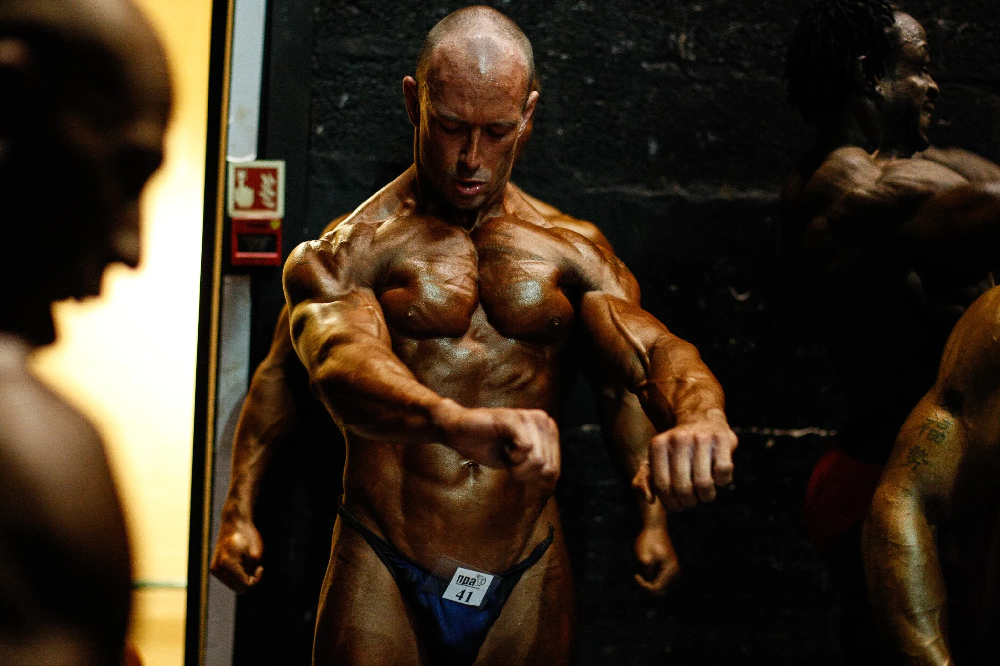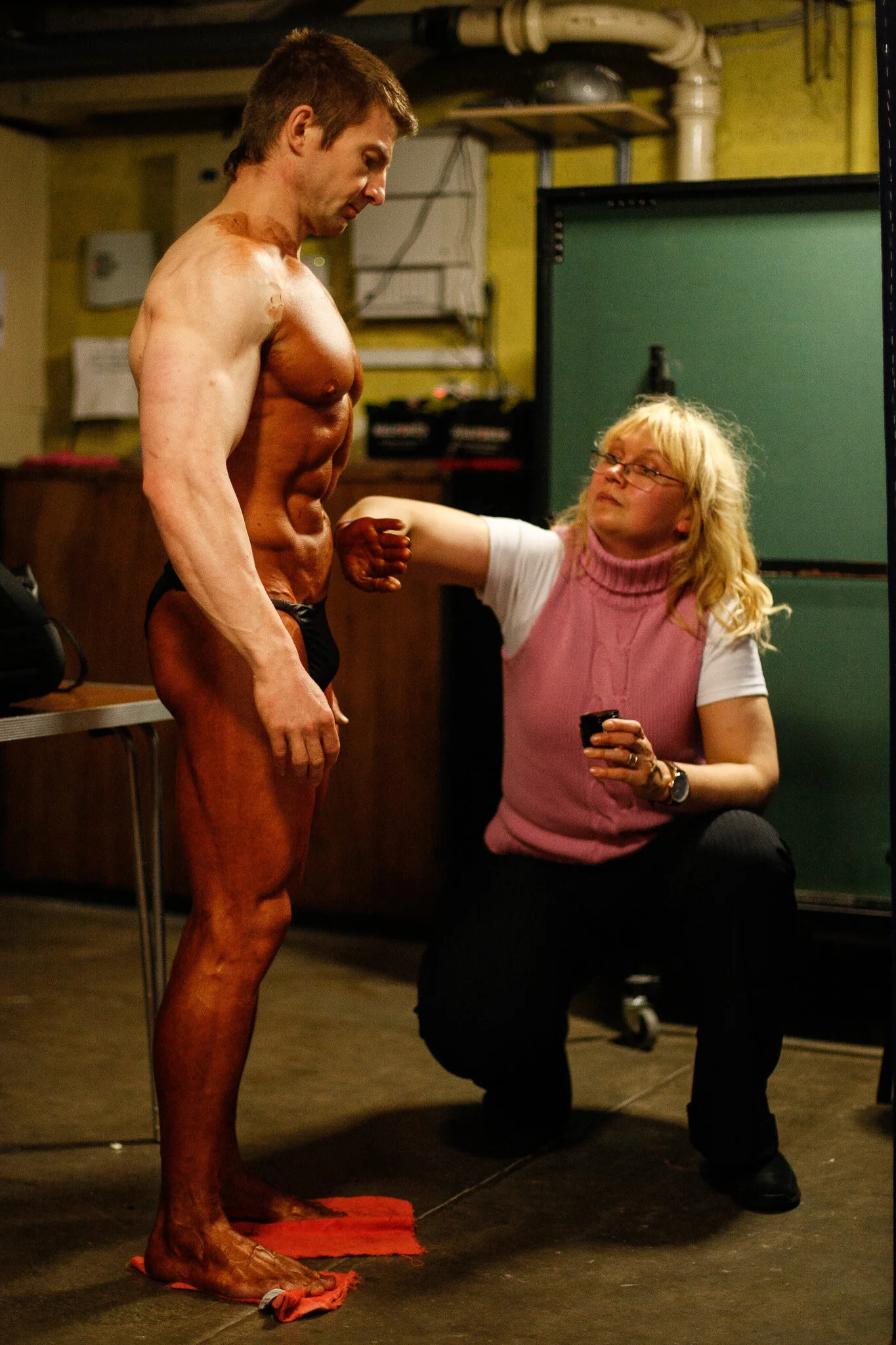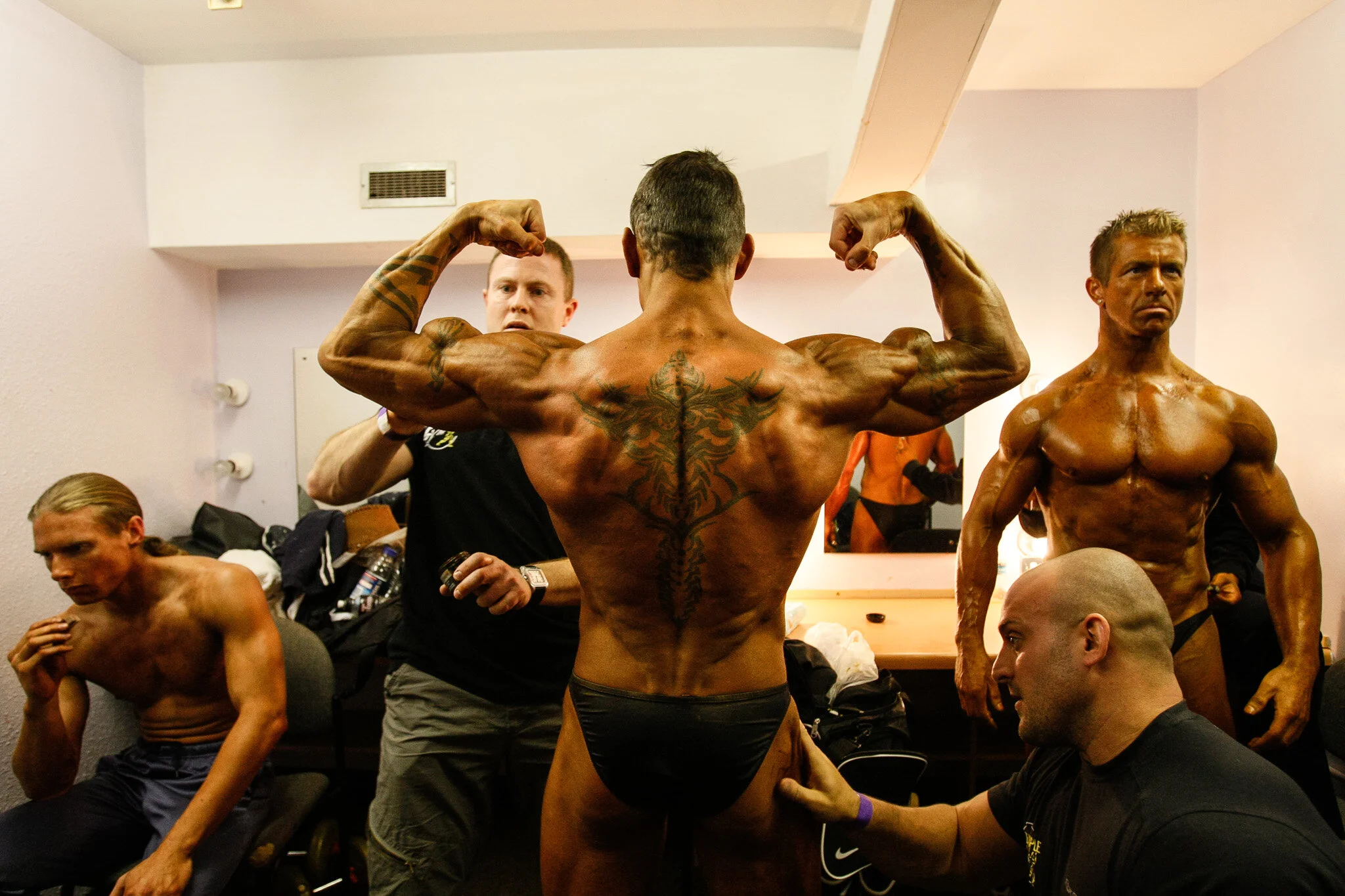 Bodybuilders from the Natural Physique Association prepare to compete in their national finals. “Natural” bodybuilders eschew the steroids prevalent in many bodybuilding competitions and engage in drugs testing before participation.